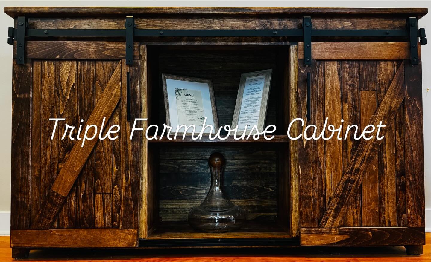 Finished in a rich English Chestnut stain, the cabinet highlights the natural character of the wood. It is crafted from aspen, and complemented by black steel hardware that adds a simple, modern contrast to the farmhouse design.